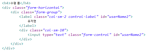 form-horizontal 은 수평폼을 만들어주는 클래스이며, 하위의 요소들을 가로로 정렬할 수 있 게 만든다.