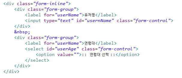 위와같이 form-inline 클래스로 form-group을 감싸주어 인라인요소로 만들어준다
